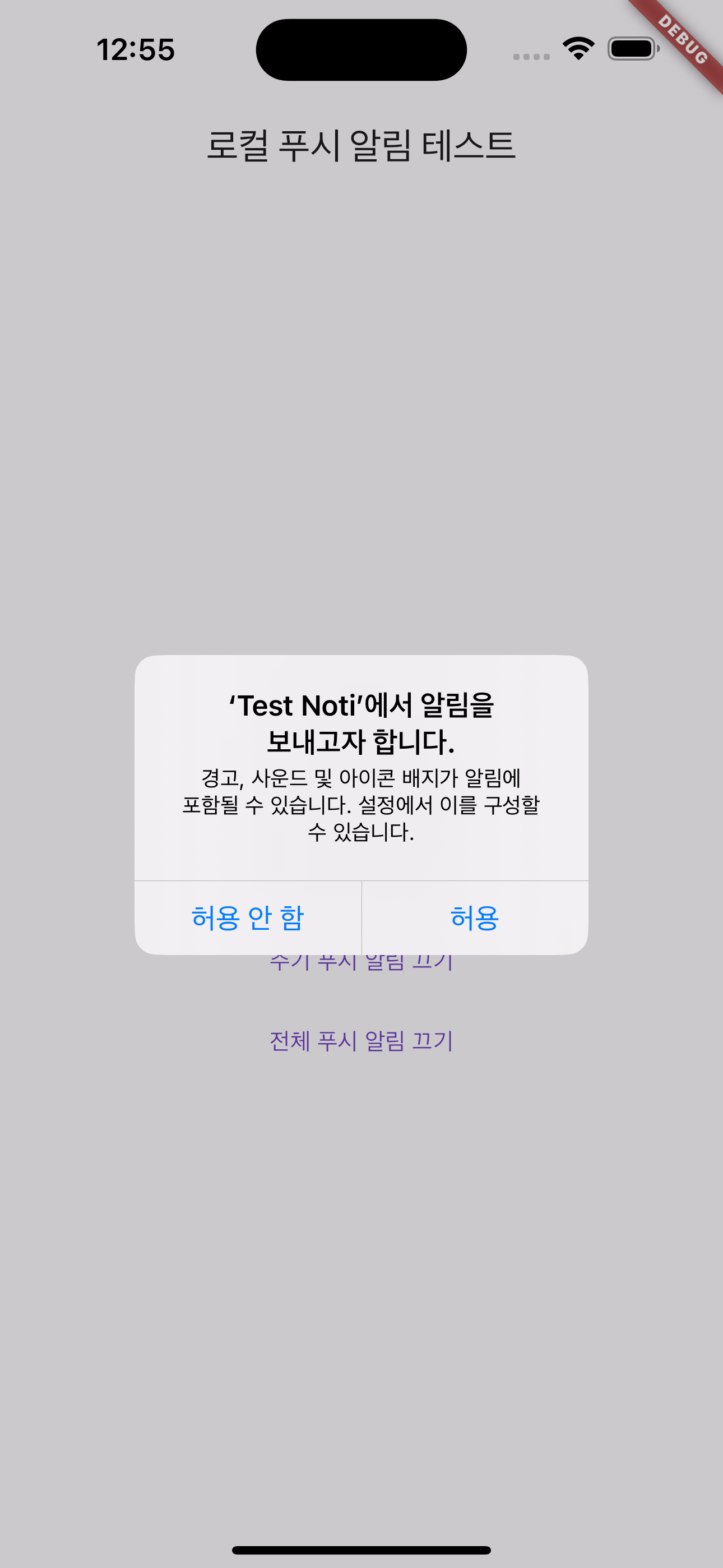 앱을 빌드하고 실행하게 되면 처음에 아래 화면과 같이 알림 요청이 뜹니다.