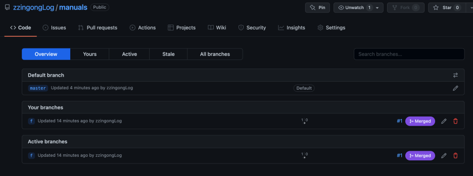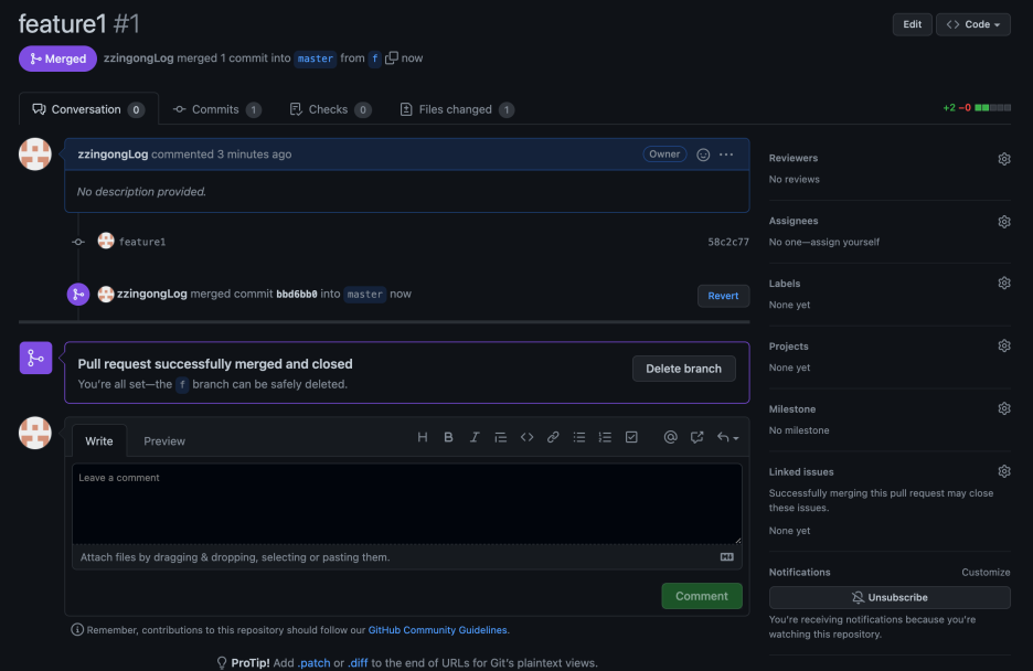 브랜치가 병합된 상태라면 merged라고 표시가 되어있습니다. 또한 누가 병합했는지 상태를 알 수 있습니다.