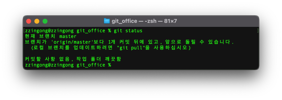 git status를 해보면 아래와 같이 1개가 뒤처져 있다고 나오며 지역저장소를 업데이트 할 수 있다고 알려줍니다.