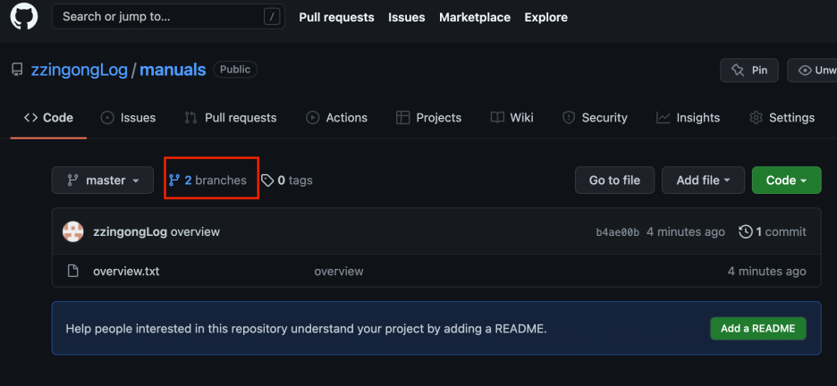 브랜치 상태를 알고 싶다면 파일 목록 위에 있는 2 branches를 눌러보세요.