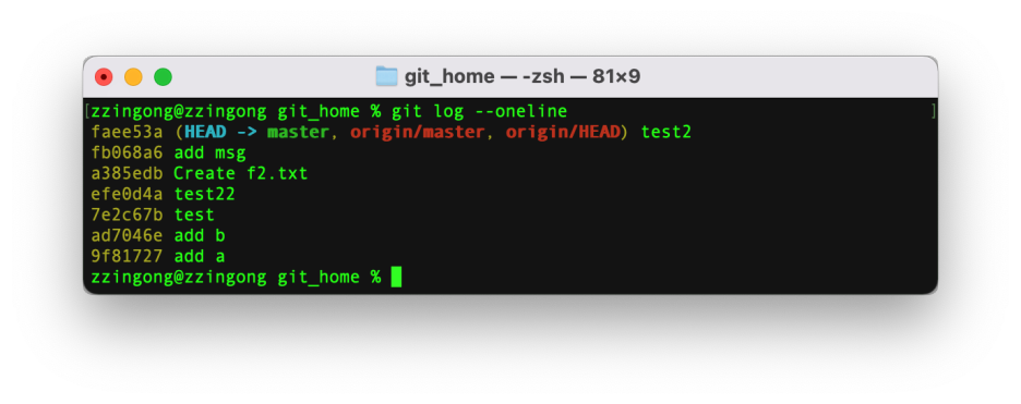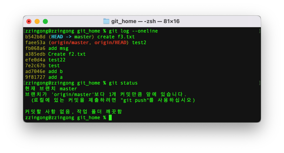 git_home디렉토리로 이동한 후 git log --oneline으로 확인해보면 아래와 같다.