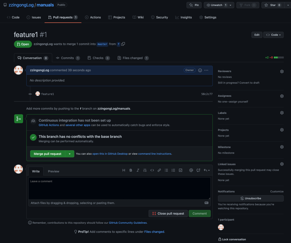(2) 풀 리퀘스트로 푸시한 브랜치 병합하기