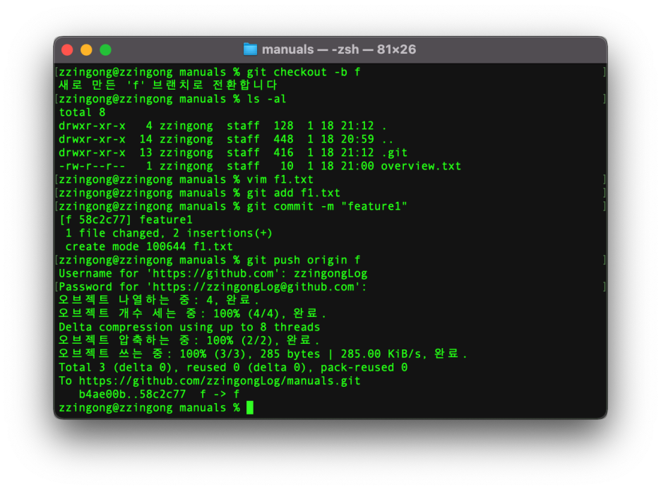 git push origin f 라고 하면 원격 저장소에 f 브랜치를 푸시할 수 있습니다.