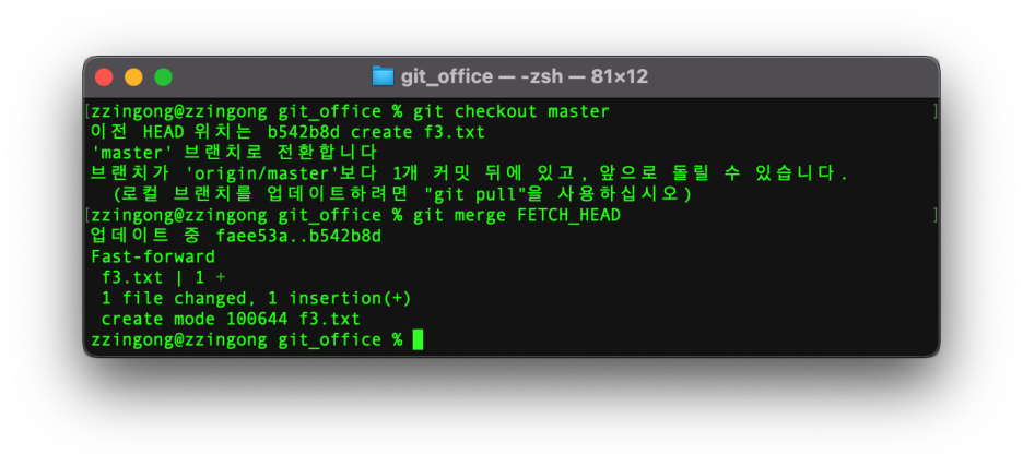 fetch한 후에 최신 커밋을 git pull할수도 있고, git merge 명령으로 FETCH_HEAD에 있던 커밋을 병합할 수도 있습니다. 여기에서는 git merge 명령으로 해봅시다.