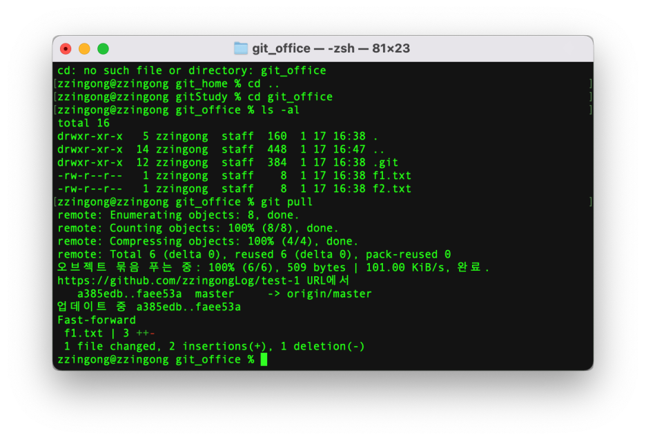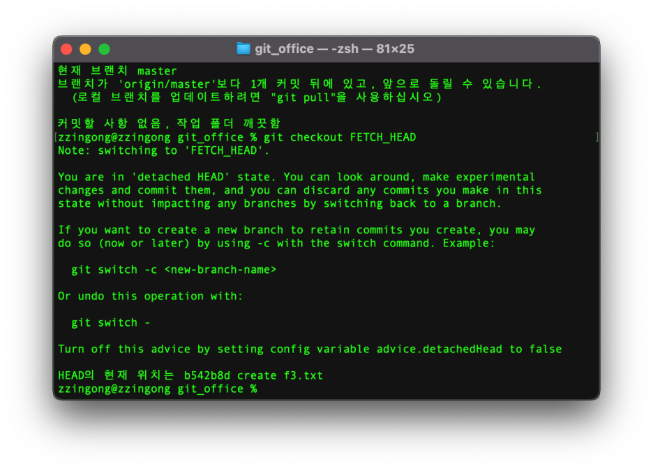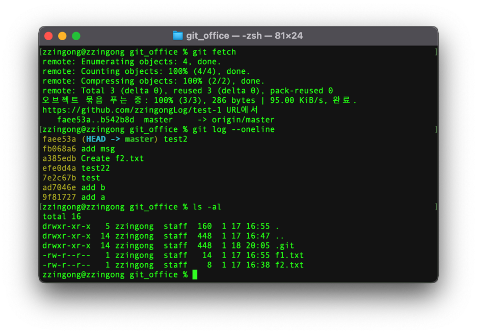 그이유는 원격 저장소의 최신 커밋 정보를 가져왔으나 아직 지역 저장소에 합치지 않아 원래 git_office에 있던 최신 커밋만 나타나기 때문입니다.