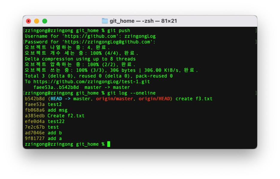 git push 명령을 사용하여 원격 저장소로 올린 후 커밋 로그를 확인해보면 다시 지역저장소와 원격저장소가 같은 커밋을 가리키는 것을 확인할 수 있습니다.