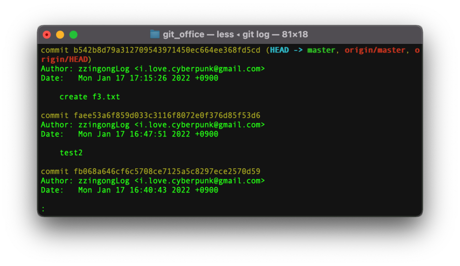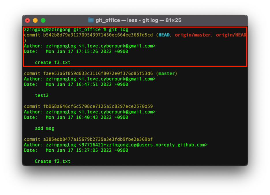 git log 를 사용해보면 최신 커밋에 origin/master와 origin/HEAD가 표시되어 있습니다.