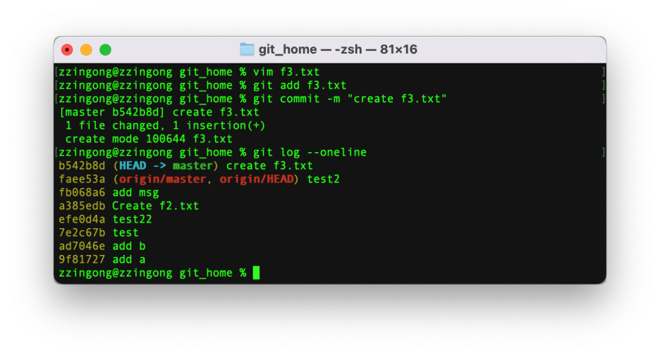 여기서 f3.txt파일을 생성하고 커밋한 후에 로그를 확인해봅시다.