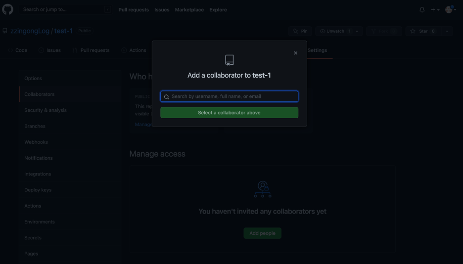 저장소 화면에서 Setting을 누른 후 Collaborators를 선택합니다. 그리고 Add people 을 누릅니다.