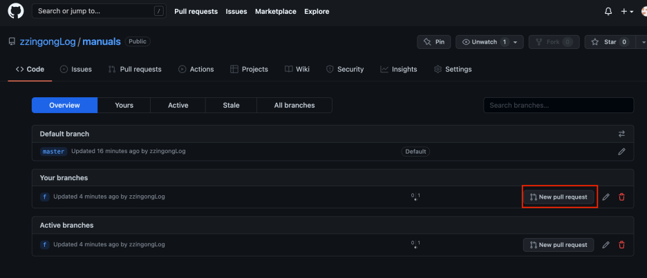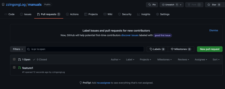 저장소 파일 목록 위의 pull request를 누르면 풀 리퀘스트 목록이 나타납니다.
