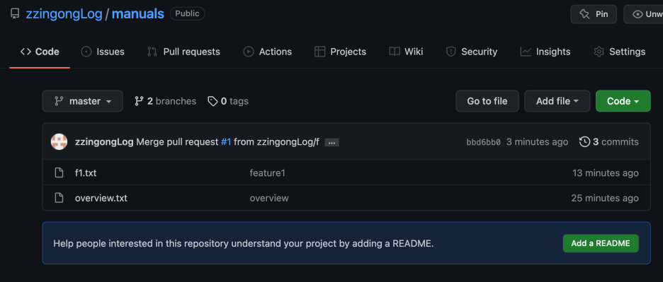 아직 원격 저장소의 파일 목록에는 f 브랜치에서 만들었던 파일이 master브랜치에는 없습니다.