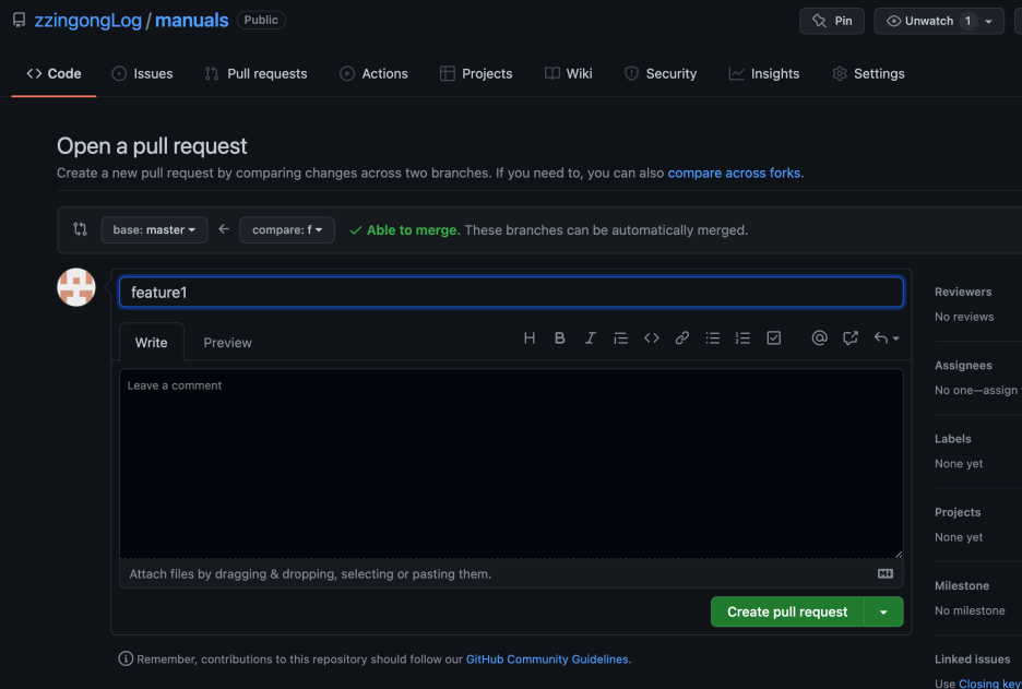 풀 리퀘스트 메시지를 작성한 후 Create pull request를 누르면 협업 중인 저장소에 풀 리퀘스트가 전송됩니다.
